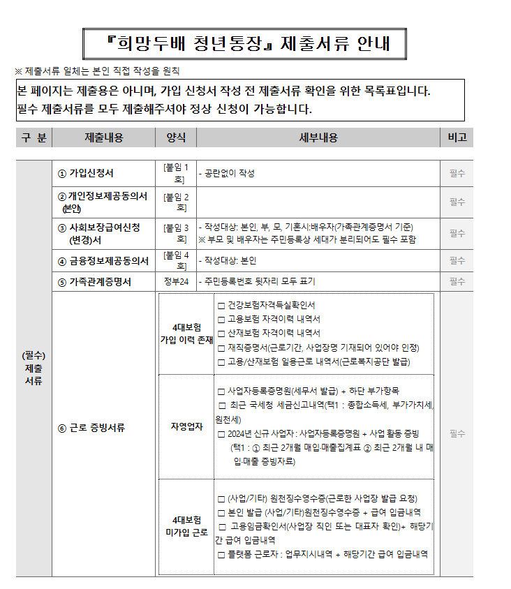 희망두배 청년통장 제출서류 안내