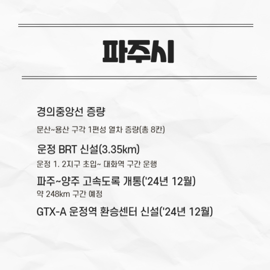 파주시에는 운정신도시 및 파주 외곽지역(적성면, 법원읍 등)에서 운정역으로 운행하는 시내·마을버스 노선도 확충되어 광역철도와의 접근성이 높아지고 파주~양주 고속도로가 24년 12월 약 248km 구간을 개통예정입니다.