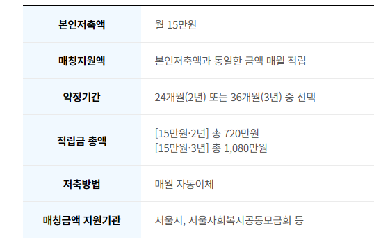 본인 월 저축액이 월 15만원으로 24개월 또는 36개울 중 선택하여 매월 자동이체를 하면서 서울시, 서울사회복지공모금 등에서 저축액의 100%를 추가 적립을 해줍니다.